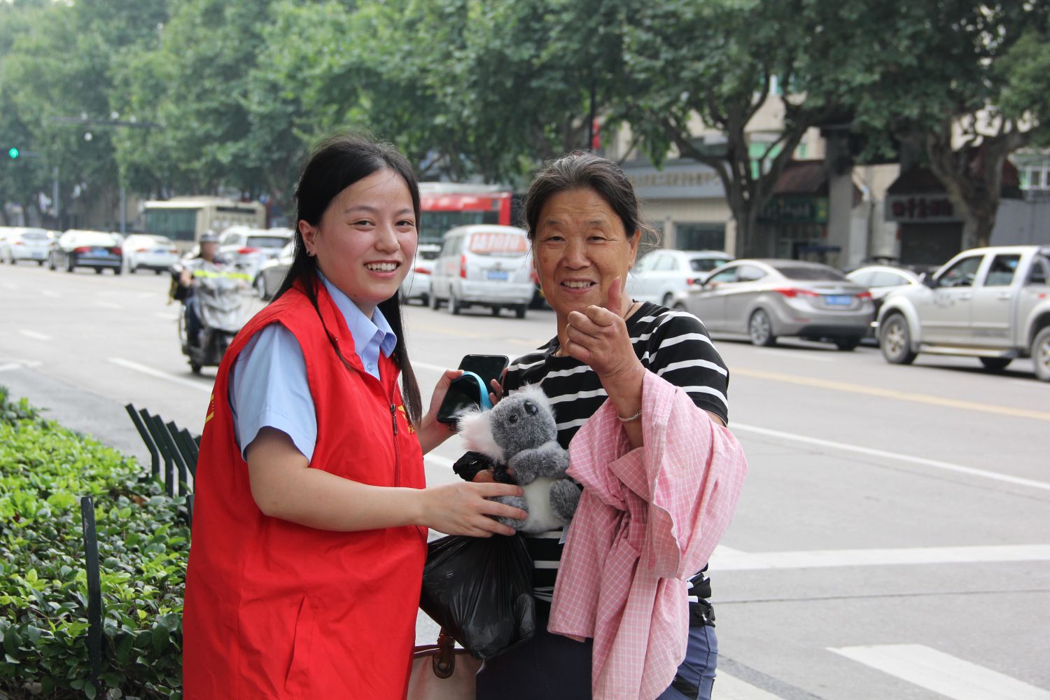 在過(guò)街路口,志愿者們?yōu)橥媸謾C(jī)、慢通行的市民送上了考拉玩偶作為激勵(lì),并進(jìn)行了友情勸導(dǎo);而對(duì)于文明快速通過(guò)斑馬線(xiàn)的市民,則贈(zèng)送一把雨傘予以獎(jiǎng)勵(lì),意在為“閃電俠”再“充電”。還有的志愿者手舉指示牌組織行人統(tǒng)一通過(guò),減少行人三三兩兩穿行的現(xiàn)象;有的志愿者對(duì)行動(dòng)不便的老人和幼兒進(jìn)行攙扶,保障通行安全。