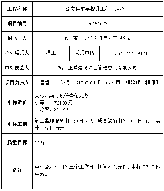 本工程于2015年 11月 13 日在杭州蕭山交通投資集團有限公司(蕭山區經濟技術開發區華瑞中心1幢5樓)會議室公開開標,經評標委員會推薦,現對擬中標人進行公示:
