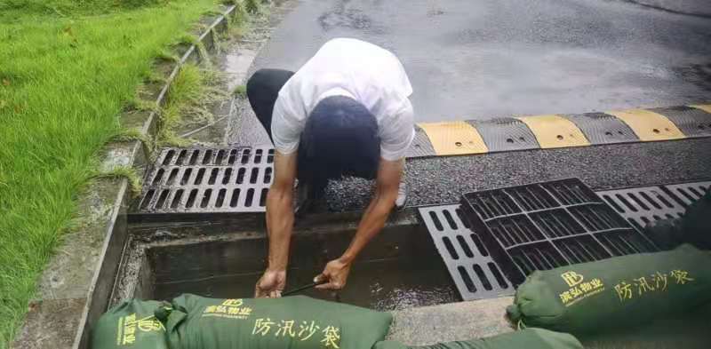 暴雨來臨,疏通下水道,排除積水防止漫灌成為最重要的工程。濱弘物業(yè)人在積水中尋找排水口,疏通排水管道,用防汛沙袋及時封堵出路口,為最大程度阻止雨水溢流車庫。