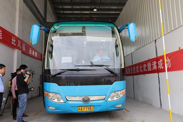 本次技能比武分為理論測(cè)試和實(shí)踐操作兩個(gè)環(huán)節(jié),總共有16名選手參賽,其中8人來自蕭山長運(yùn)公司,8人來自蕭山公交公司。這批選手的平均年齡在42歲左右,駕齡普遍超過15年,其中最長的駕齡29年,最短的也有12年,可以說都是經(jīng)驗(yàn)豐富的老師傅了。據(jù)承辦方負(fù)責(zé)人介紹,實(shí)踐操作比賽中所有選手駕駛的都是同一輛客車,按照抽簽順序依次從臨浦客運(yùn)站出發(fā),按照同一路線行駛完畢后再回到出發(fā)點(diǎn)倒車入庫,總行駛里程約24公里,耗時(shí)45分鐘,如果超過這一時(shí)間就要扣分。比武車輛內(nèi)部設(shè)有實(shí)時(shí)監(jiān)控裝置,由3名裁判對(duì)選手行車過程中的操作行為進(jìn)行相應(yīng)打分,此外車上還有專人監(jiān)測(cè)實(shí)時(shí)油耗,耗能量作為一項(xiàng)重要指標(biāo)計(jì)入總分。區(qū)總工會(huì)副主席胡國榮,區(qū)交投集團(tuán)副總經(jīng)理王齊天為前三名獲獎(jiǎng)?wù)哳C發(fā)了獎(jiǎng)杯和榮譽(yù)證書。