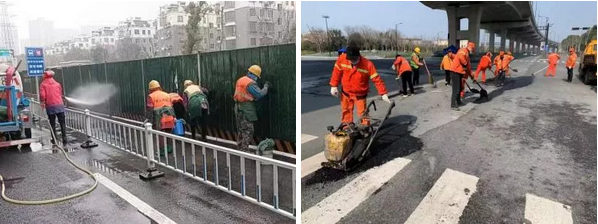 路橋工程公司項目組值班人員堅守一線,對各在建道路進行路況排查,對時代大道等進行路面修補與道路保潔,確保春節期間道路安全。