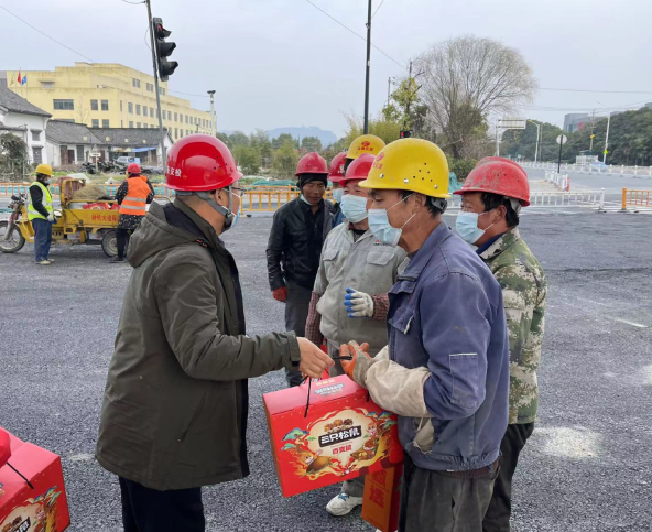 正值團圓的春節假期,區交投集團黨委委員、副總經理金文華、建管公司副總經理、工會主席王國芳對交通建管公司承建的“22688”交通建設項目時代大道改建工程留守的民工進行慰問。