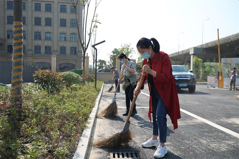 此次黨日活動主題為“迎亞運 ——志愿保障服務”,同時響應即將到來的國際“五一”勞動節(jié)。黨員志愿者們致力于維護亞運會保障工程的美潔,紛紛拿出工具清掃起來。頂著將近30度的太陽,189個車輛停車位上的落葉及白色垃圾在15名黨員和入黨積極分子志愿者的共同努力下,耗時50分鐘就清理完畢,呈現(xiàn)出光鮮亮麗的形象。