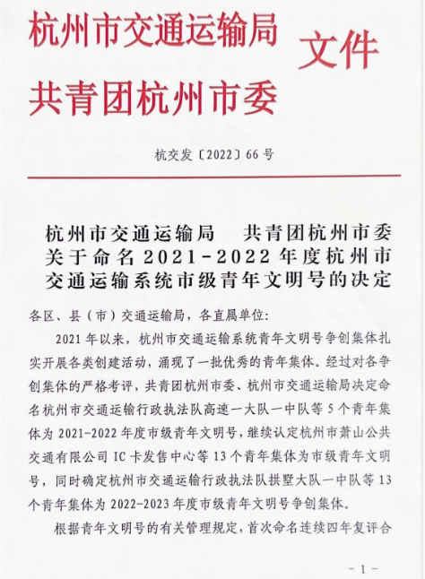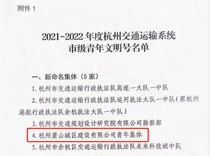 近日,杭州市交通運(yùn)輸局聯(lián)合共青團(tuán)杭州市委共同下發(fā)《關(guān)于命名2021-2022年度杭州市交通運(yùn)輸系統(tǒng)市級青年文明號的決定》, 城區(qū)建設(shè)公司青年集體榮獲2021-2022年度杭州交通運(yùn)輸系統(tǒng)市級“青年文明號”。