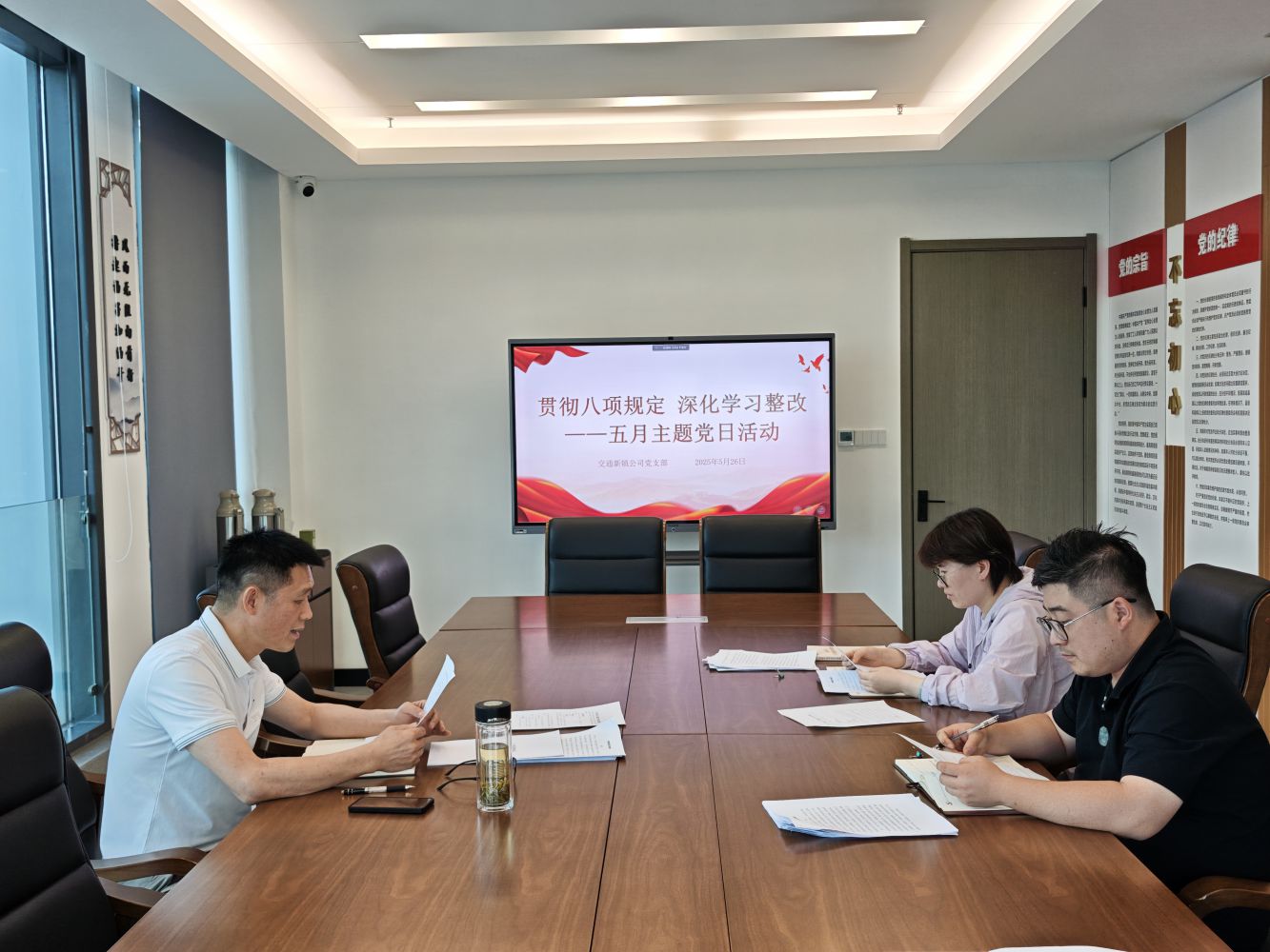 為扎實(shí)推進(jìn)深入貫徹中央八項(xiàng)規(guī)定精神學(xué)習(xí)教育,推動(dòng)學(xué)習(xí)教育走深走實(shí),5月26日,交通新鎮(zhèn)公司黨支部召開“貫徹八項(xiàng)規(guī)定 深化學(xué)習(xí)整改”五月主題黨日活動(dòng)。
