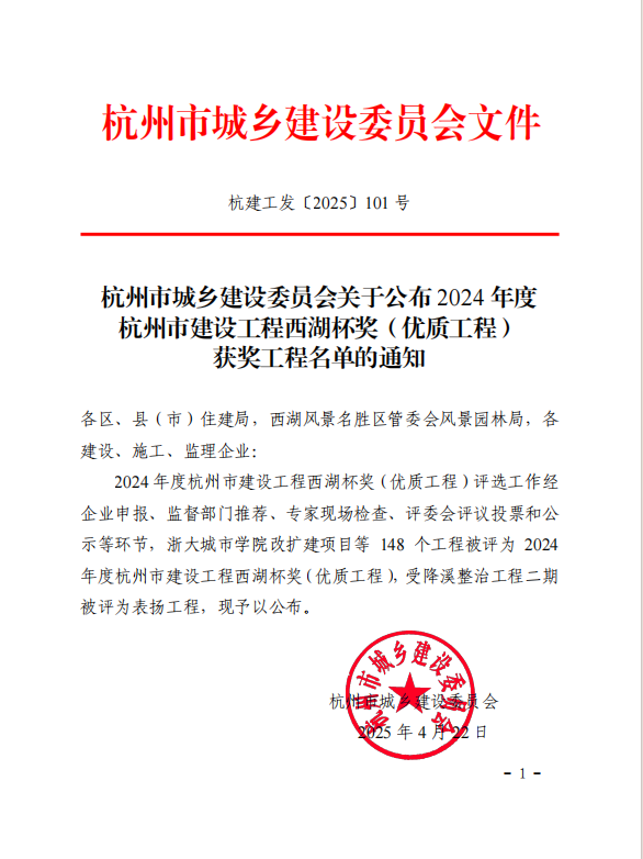 近日,根據(jù)《杭州市建設工程西湖杯獎(優(yōu)質(zhì)工程)獲獎工程名單的通知》,由集團下屬城區(qū)建設公司承建的北干街道山口單元B-06地塊建設公共租賃用房工程、北干街道城北公共租賃用房建設工程、義橋鎮(zhèn)山后村城中村改造安置房均被評為——2024年度杭州市建設工程西湖杯獎(優(yōu)質(zhì)工程)。