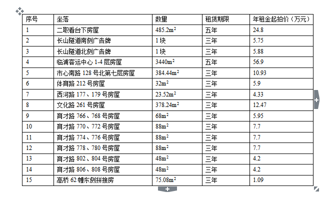 所有標的租賃期限開始日:2015年1月10日;5、6、7、8、15號標的已辦理《房屋所有權證》,其余標的無《房屋所有權證》;所有標的無《土地使用證》;15號標保證金0.5萬元,其余標的保證金4萬元/標的。