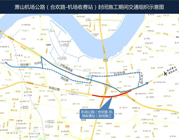 從2014年11月18日10時至2016年4月30日,蕭山機場公路改建工程合歡路至機場收費站段將實行全封閉施工。走替代道路比以往要多花10分鐘左右,請前往機場的市民提前做好出行準備。