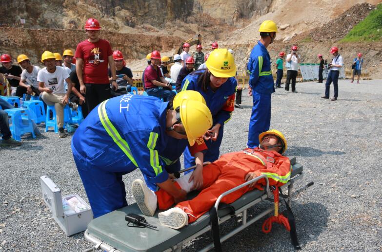 本次演練共設兩個場景,分別是工作人員A某在進行清坡作業時被落石砸中和B某在進行挖機作業時突然出現胸悶、惡心、頭暈等癥狀。在現場應急救援領導小組的統一指揮下,通訊聯絡組、搶險救援組、現場保衛組 、后勤保障組 、醫療救護組等五個小組分工合作、積極救援、控制險情,確保了傷員安全撤離及現場隱患排除。