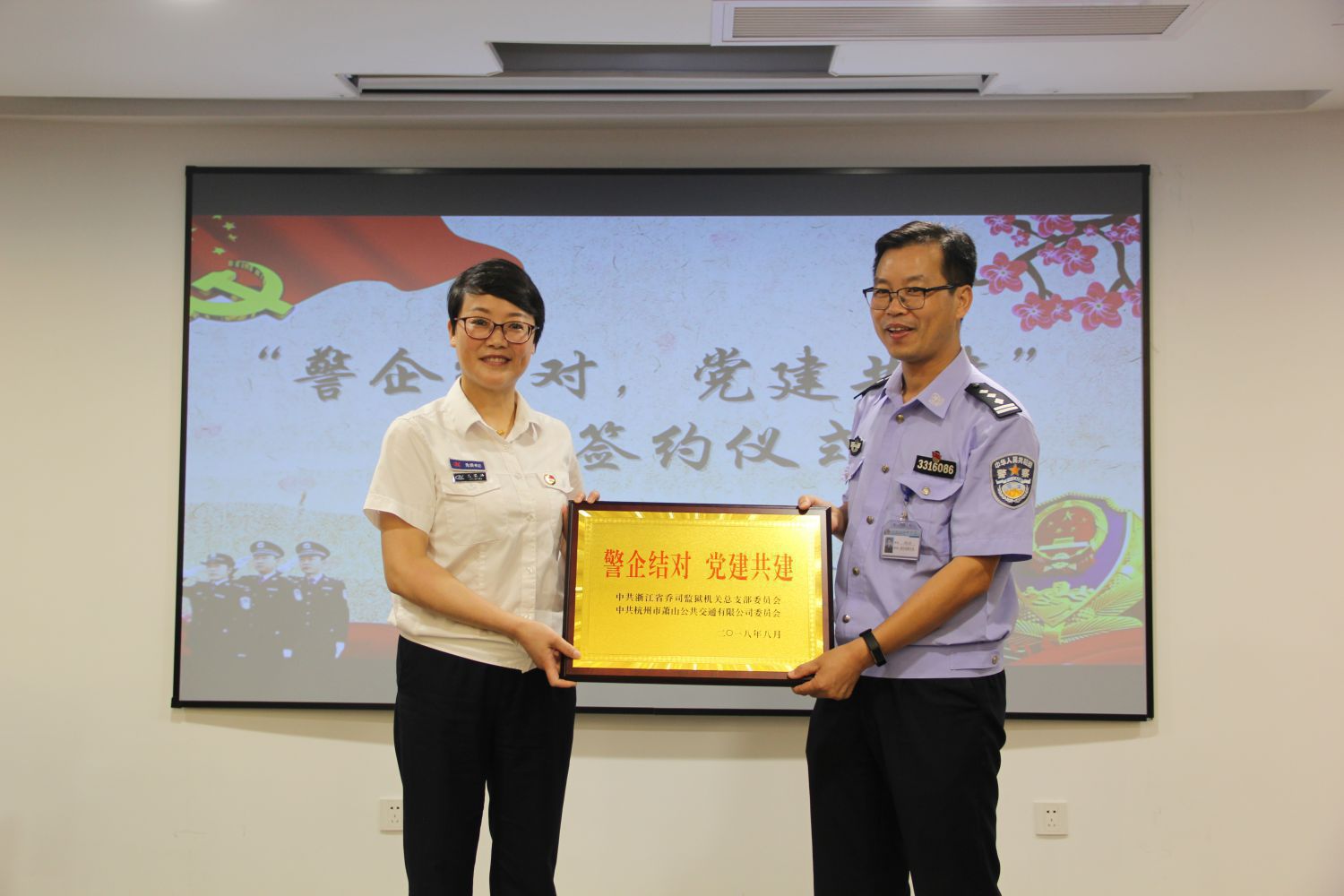 活動中,全體黨員干部在監獄陳列館內進行了參觀,隨后集體組織觀看廉政教育視頻短片。結對簽約儀式上,省喬司監獄黨委委員、副監獄長胡忠南作致辭,政治處副主任周立功宣讀了黨建結對共建內容;蕭山公交黨委書記王黎洪和周副主任現場簽訂了《黨建結對共建協議書》,并互贈共建牌匾。儀式最后,公司吳根法董事長與王黎洪書記分別作了總結發言。