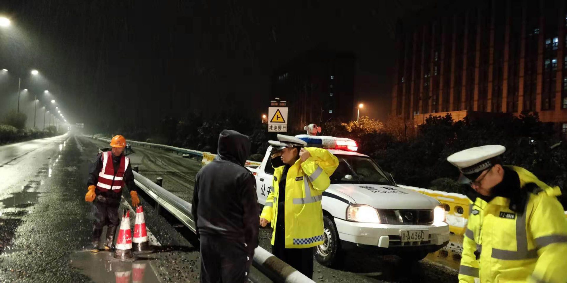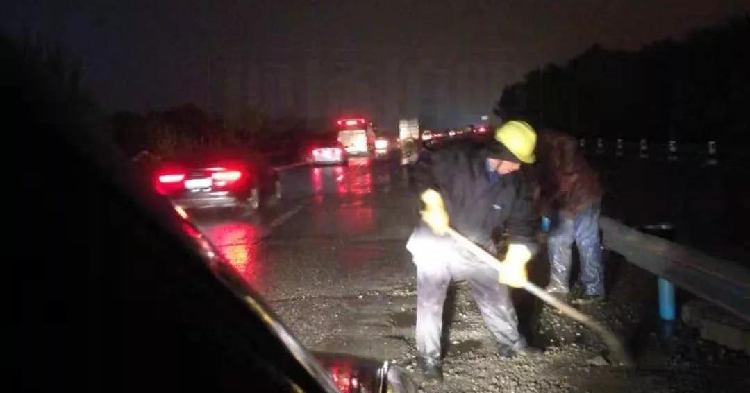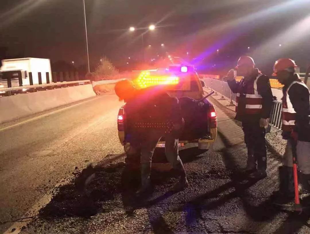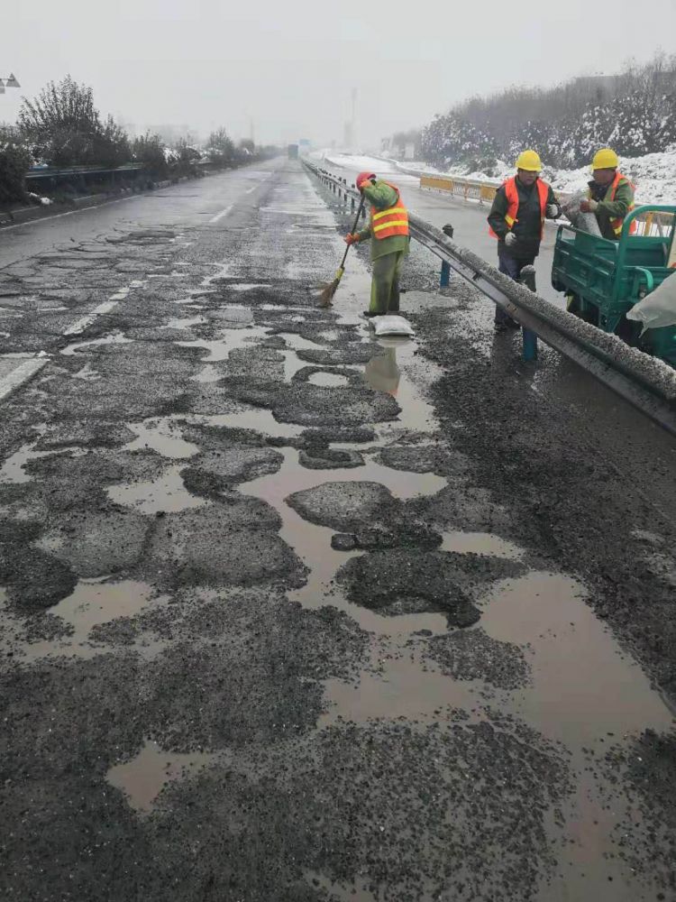 9日大雪,集團各部門第一時間啟動雨雪天氣應急預案,增加了應急保障力量,進行24小時巡查,對路面坑洞進行修補及除雪除冰??紤]到天氣、重荷載車輛多等因素,采用了水泥穩定碎石混合料、瀝青冷料等進行臨時修補,同時增設警示標志,確保道路正常有序通行。期間,共投入物資有工業鹽16噸、草袋1500個、瀝青混凝土冷料26噸、水泥穩定碎石干拌料50噸、快干水泥8噸、錐形帽500個、警示燈230個;投入安全巡邏車、鏟車、挖機、運輸車輛等機械設備共17臺(套);